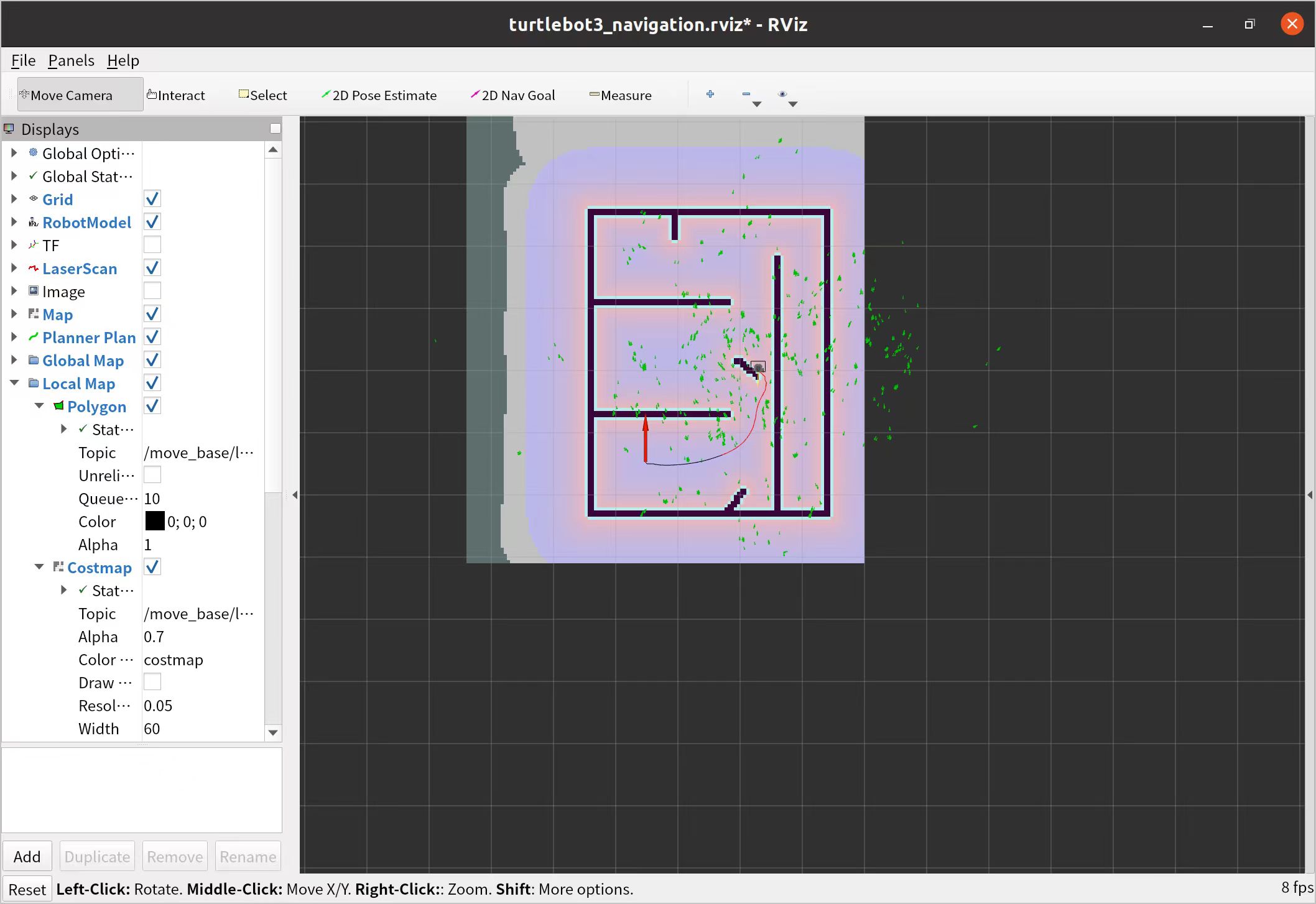 启动 TurtleBot3 的导航系统并打开RViz显示(终端D)。