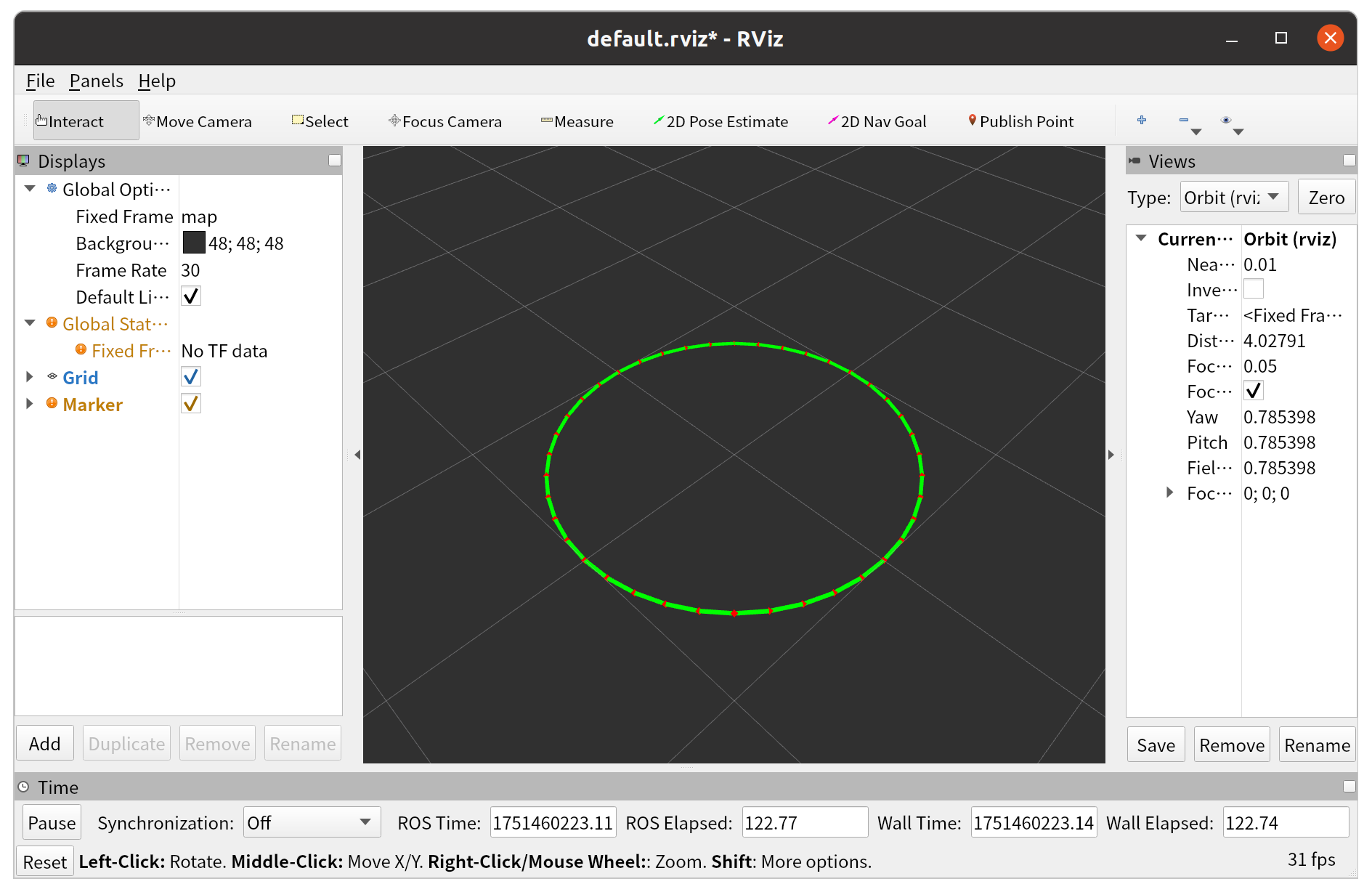 将RViz左侧 Global Options 面板中 Fixed Frame 改为程序中的 world 。