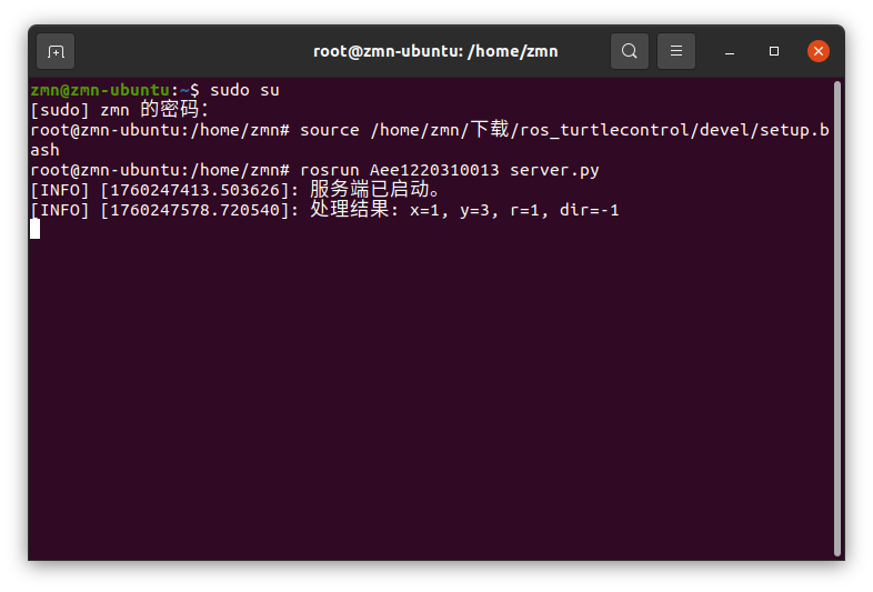 注:在启动服务端程序前需要赋予环境变量(终端要在 ros_turtlecontrol 文件夹下,或最好使用文件的完整路径),如何设置过全局环境变量可忽略 source 命令,仅执行 rosrun 即可